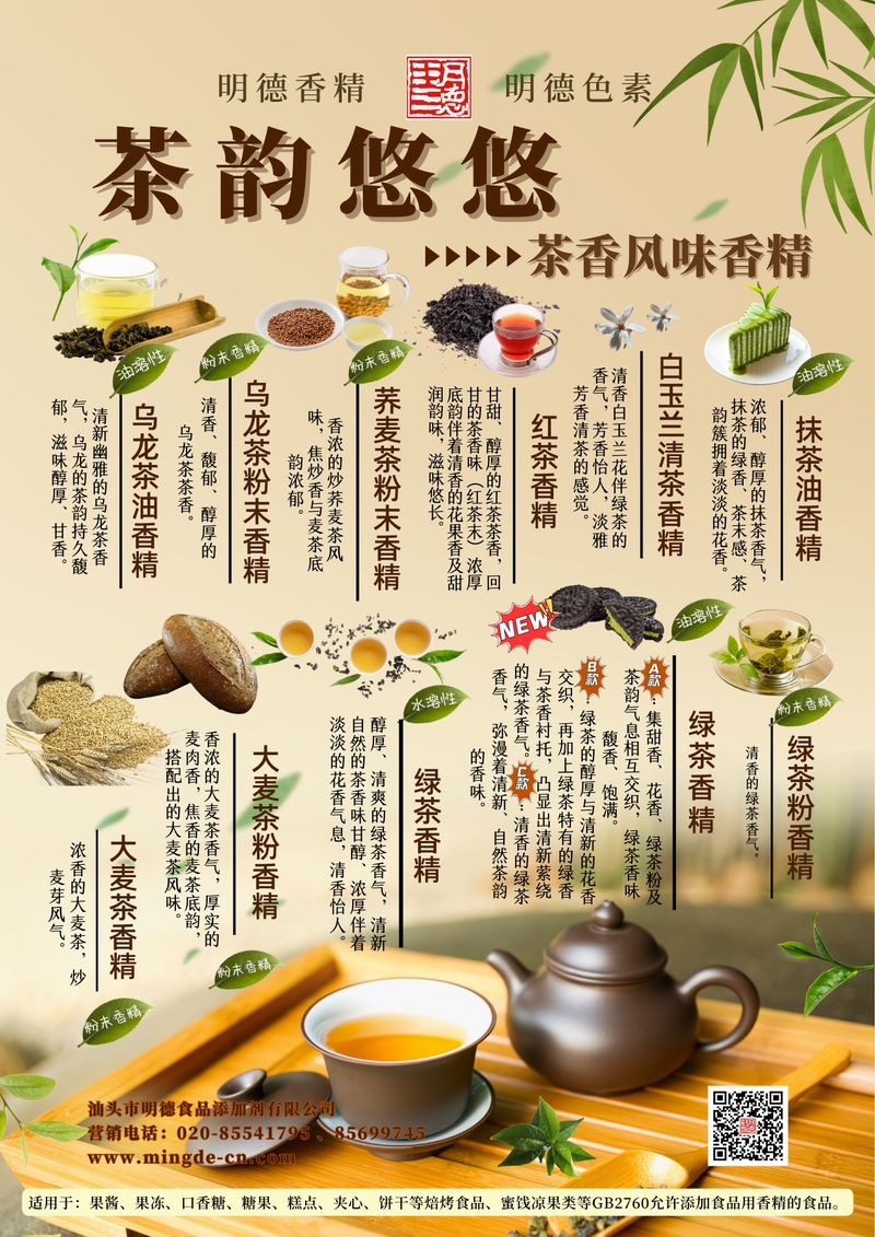 汕頭市明德食品添加劑有限公司推出的茶香風味系列香精,涵蓋烏龍茶、蕎麥茶、紅茶、白玉蘭清茶、抹茶、大麥茶、綠茶等多種茶類調(diào)性,滿足飲品、烘焙、糖果、乳制品、調(diào)味品等多領(lǐng)域的茶香需求,為B端客戶提供穩(wěn)定、真實的茶韻香氣解決方案。